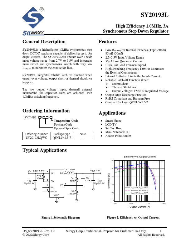 SY20193Lis a highefficient1.0MHz synchronous step down DC/DC regulator capable of delivering up to 3A output current. The SY20193Lcan operate over a wide input voltage range from 2.7V to 5.5V and integrates main switch and synchronous switch with very low RDS(ON) to minimize the conduction loss.