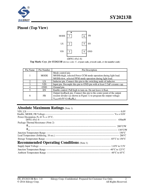 Features The SY20213B is a high efficiency 3MHz synchronous step down DC/DC regulator IC capable of delivering up to 0.6A output current. It can operate in PFM or CCM mode during light load programed by MODE pin. It can operate over a wide input voltage range from 1.85V to 5.5V and integrate main switch and synchronous switch with very low RDS(ON) to minimize the conduction loss.