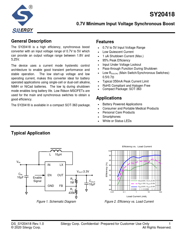 The SY20418 is a high efficiency, synchronous boost converter with an input voltage range of 0.7V to 5V which can provide an output voltage range between 1.8V and 5.25V.