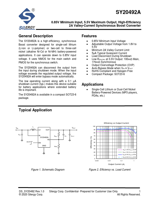 The SY20492A is a high-efficiency, synchronous Boost converter designed for single-cell lithium (Li-ion or Li-polymer) or two-cell to three-cell nickel (alkaline Ni-Cd or Ni-MH) battery-powered applications. It can operate down to 0.85V input voltage. It uses NMOS for the main switch and PMOS for the synchronous switch.
