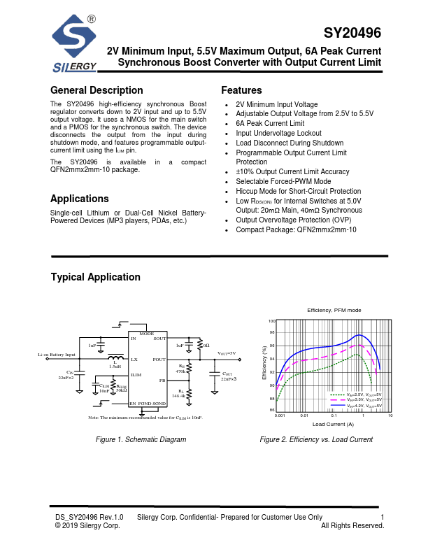 The SY20496 high-efficiency synchronous Boost regulator converts down to 2V input and up to 5.5V output voltage. It uses a NMOS for the main switch and a PMOS for the synchronous switch. The device disconnects the output from the input during shutdown mode, and features programmable outputcurrent limit using the ILIM pin.