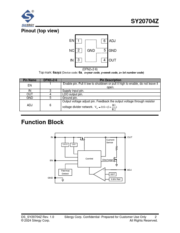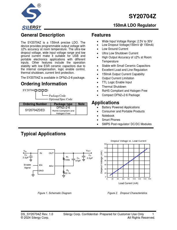 The SY20704Z is a 150mA precise LDO. The device provides programmable output voltage with ±2% accuracy at room temperature. The ultra-low dropout voltage, wide input voltage range and low ground current make it suitable for USB and portable electronics applications with different inputs.
