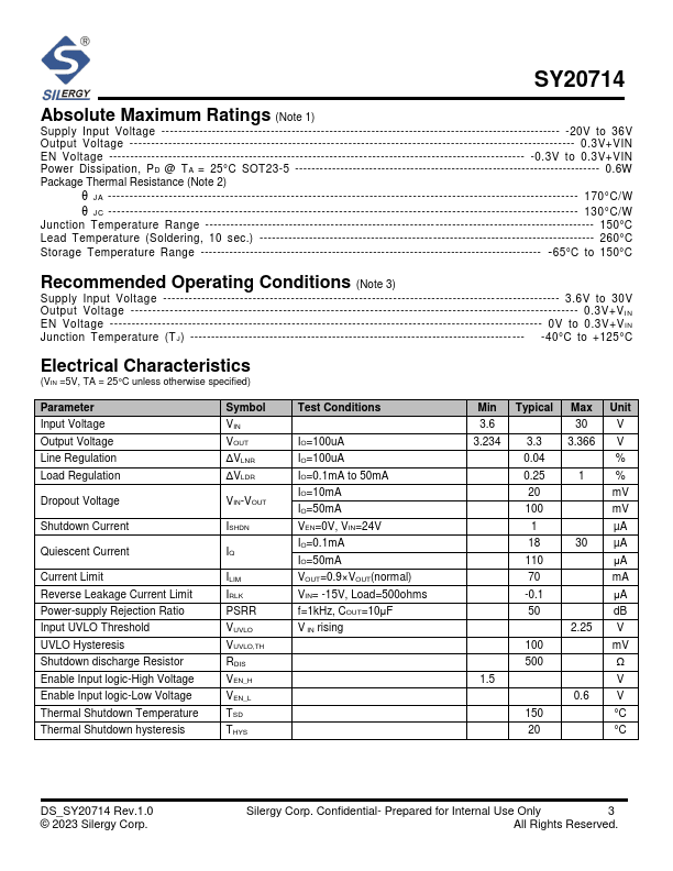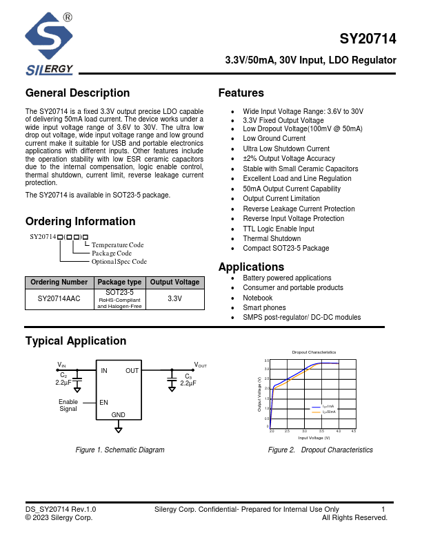 The SY20714 is a fixed 3.3V output precise LDO capable of delivering 50mA load current. The device works under a wide input voltage range of 3.6V to 30V. The ultra low drop out voltage, wide input voltage range and low ground current make it suitable for USB and portable electronics applications with different inputs.