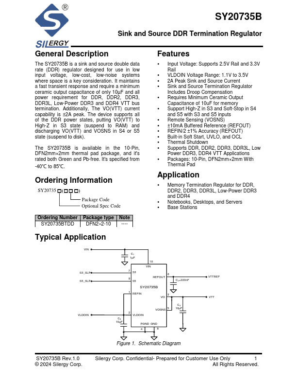 The SY20735B is a sink and source double data rate (DDR) regulator designed for use in low input voltage, low-cost, low-noise systems where space is a key consideration. It maintains a fast transient response and require a minimum ceramic output capacitance of only 10µF and all power requirement for DDR, DDR2, DDR3, DDR3L, Low-Power DDR3 and DDR4 VTT bus termination. Additionally, The VO(VTT) current capability is...