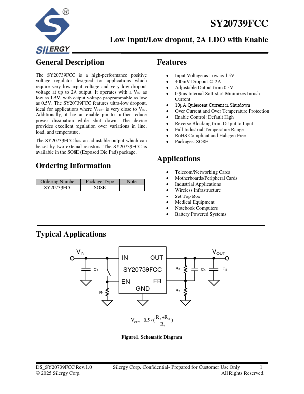 The SY20739FCC is a high-performance positive voltage regulator designed for applications which require very low input voltage and very low dropout voltage at up to 2A output. It operates with a VIN as low as 1.5V, with output voltage programmable as low as 0.5V.