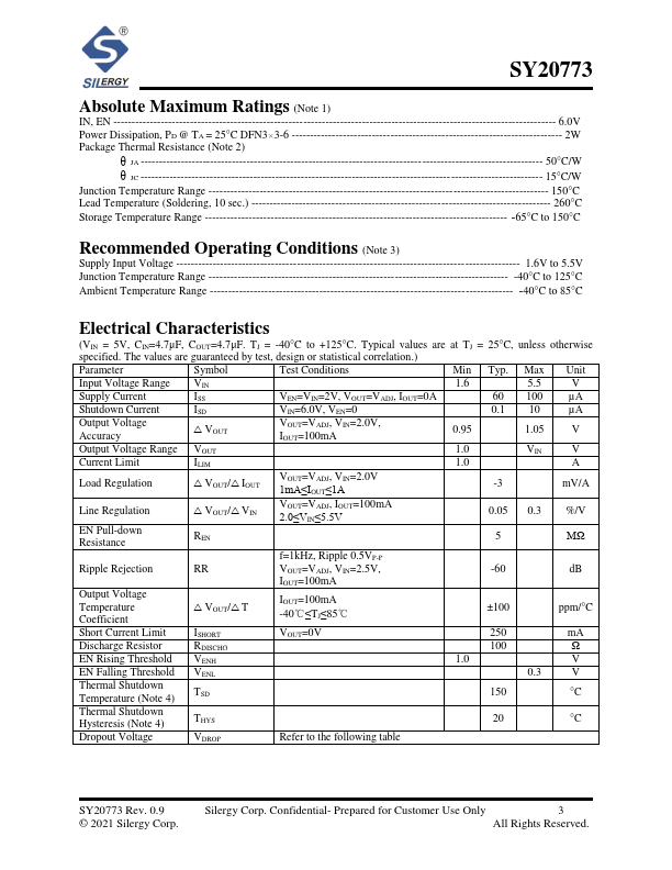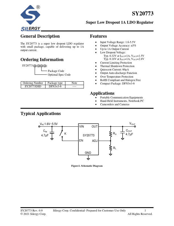 The SY20773 is a super low dropout LDO regulator with small package, capable of delivering up to 1A output current. Ordering Information SY20773 □(□□ □) Package Code Optional Spec Code Ordering Number Package type Note SY20773DSD DFN3×3-6 ----.