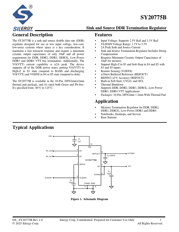 Features The SY20775B is a sink and source double data rate (DDR) regulator designed for use in low input voltage, low-cost, low-noise systems where space is a key consideration. It maintains a fast transient response and require a minimum ceramic output capacitance of only 10uF and all power requirement for DDR, DDR2, DDR3, DDR3L, Low-Power DDR3 and DDR4 VTT bus termination. Additionally, The VO(VTT) current...