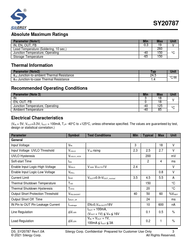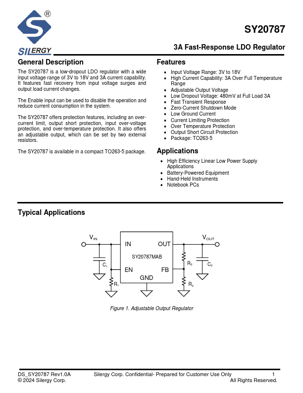 The SY20787 is a low-dropout LDO regulator with a wide input voltage range of 3V to 18V and 3A current capability.