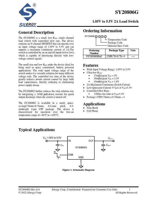 The SY20806G is a small, low RON, single channel load switch with controlled slew rate. The device contains an N-channel MOSFET that can operate over an input voltage range of 1.05V to 5.5V and can support a maximum continuous current of switch is controlled by an on and off input(Active low), which is capable of interfacing directly with lowvoltage control signals.