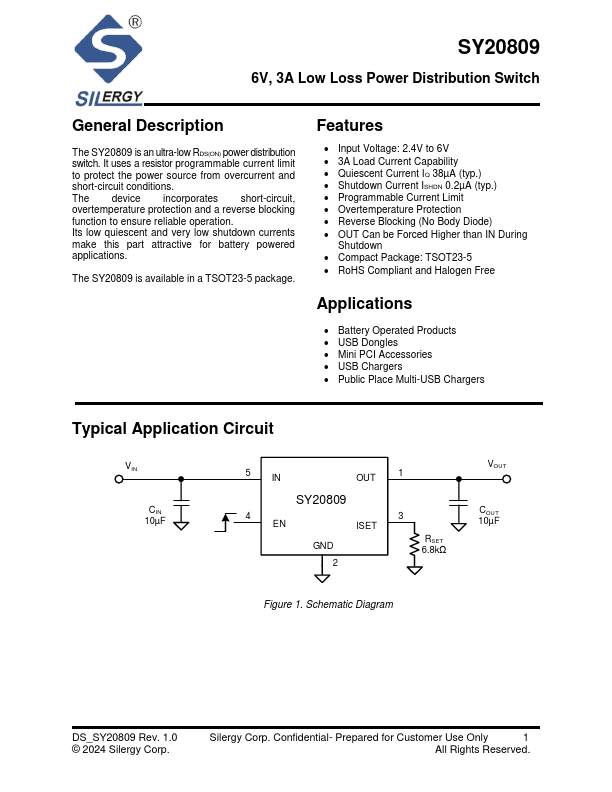 The SY20809 is an ultra-low RDS(ON) power distribution switch. It uses a resistor programmable current limit to protect the power source from overcurrent and short-circuit conditions.