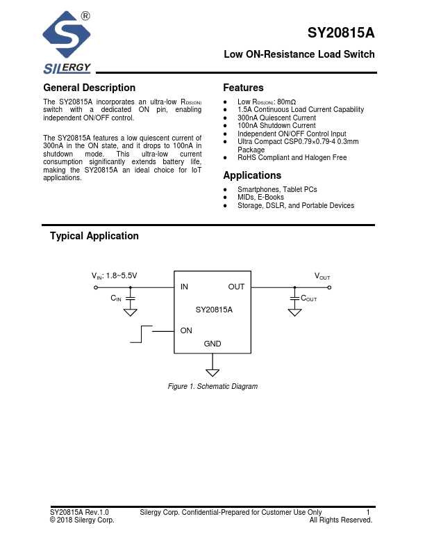 The SY20815A incorporates an ultra-low RDS(ON) switch with a dedicated ON pin, enabling independent ON/OFF control. The SY20815A features a low quiescent current of 300nA in the ON state, and it drops to 100nA in shutdown mode.