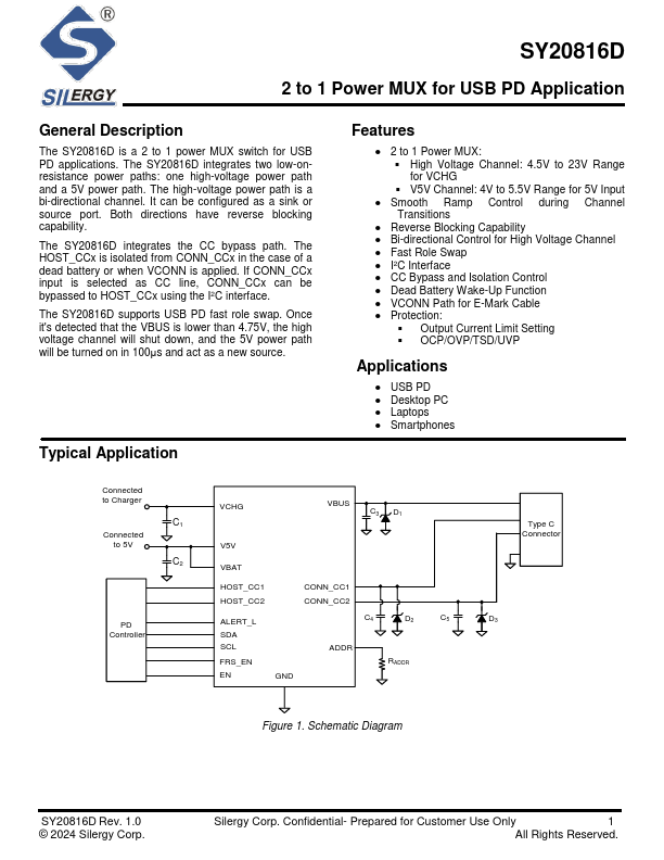 The SY20816D is a 2 to 1 power MUX switch for USB PD applications. The SY20816D integrates two low-onresistance power paths: one high-voltage power path and a 5V power path.
