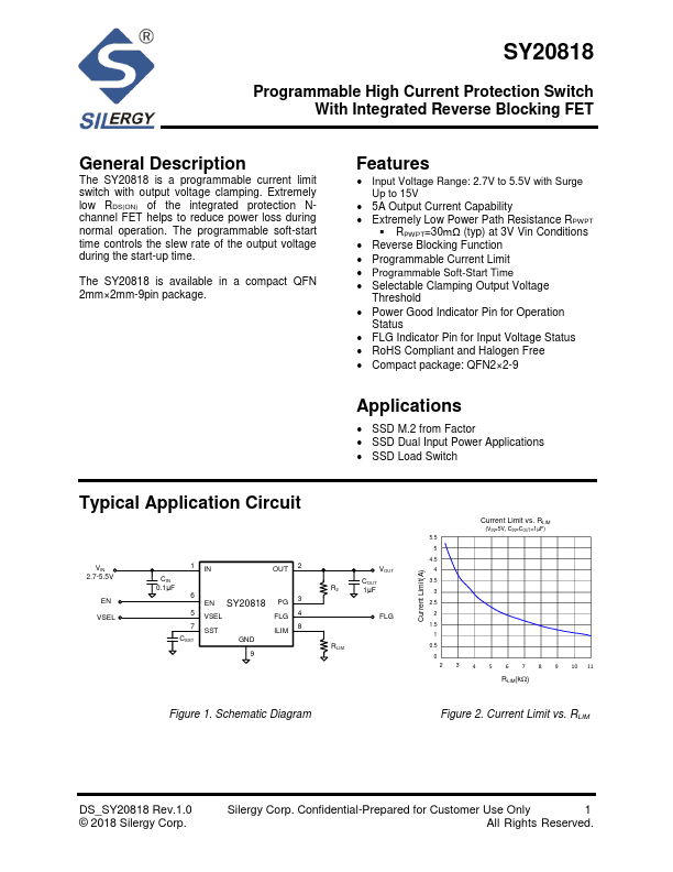 The SY20818 is a programmable current limit switch with output voltage clamping.