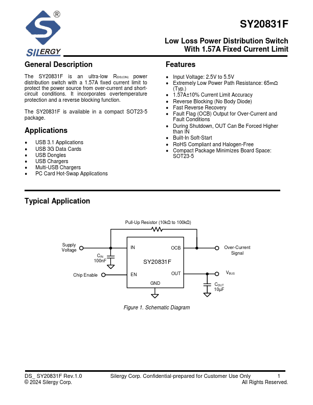 The SY20831F is an ultra-low RDS(ON) power distribution switch with a 1.57A fixed current limit to protect the power source from over-current and shortcircuit conditions. It incorporates overtemperature protection and a reverse blocking function.