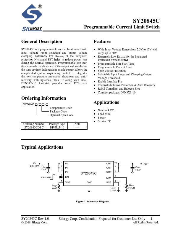 SY20845C is a programmable current limit switch with input voltage range selection and output voltage clamping.
