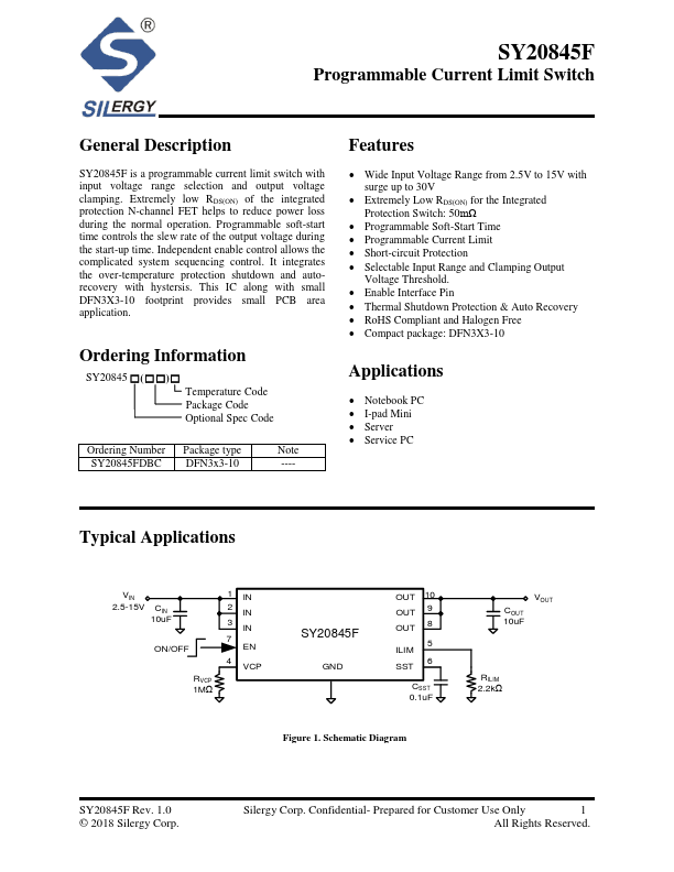 SY20845F is a programmable current limit switch with input voltage range selection and output voltage clamping.