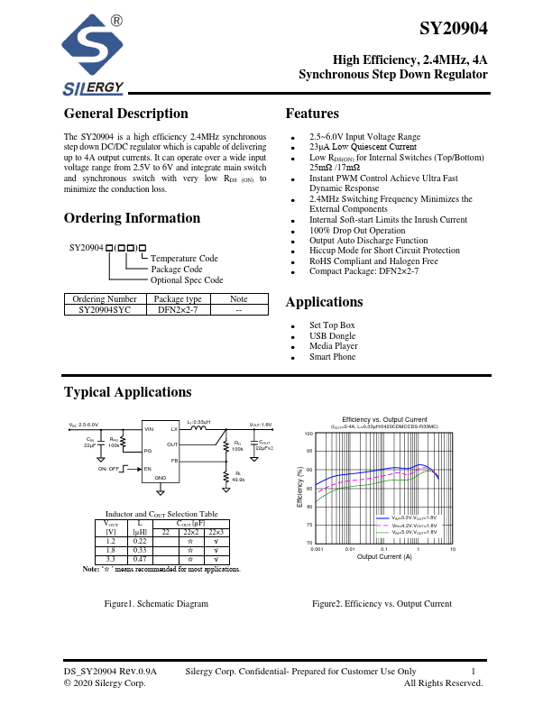 The SY20904 is a high efficiency 2.4MHz synchronous step down DC/DC regulator which is capable of delivering up to 4A output currents. It can operate over a wide input voltage range from 2.5V to 6V and integrate main switch and synchronous switch with very low RDS (ON) to minimize the conduction loss.