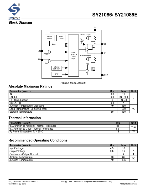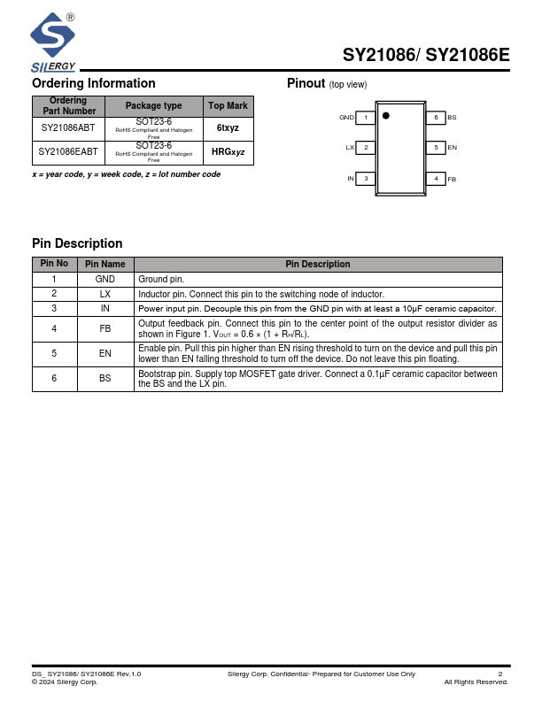 General Description The SY21086x is high efficiency synchronous buck converter operates over a wide input voltage range of 4.5V to 18V, and can deliver an output current up to 2A. It integrates a top MOSFET and a bottom MOSFET with very low RDS(ON) to minimize conduction loss. The high pseudo-constant switching frequency enables using small external inductor and capacitor values. The device uses constant on-time and ripple-based control strategy to achieve fast transient response for applications with high step-down ratios. It also provides cycle-by-cycle current limit protection, output under voltage protection and over temperature protection. Only the input and output capacitors,...