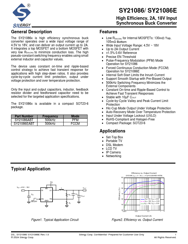 The SY21086x is high efficiency synchronous buck converter operates over a wide input voltage range of 4.5V to 18V, and can deliver an output current up to 2A. It integrates a top MOSFET and a bottom MOSFET with very low RDS(ON) to minimize conduction loss. The high pseudo-constant switching frequency enables using small external inductor and capacitor values.