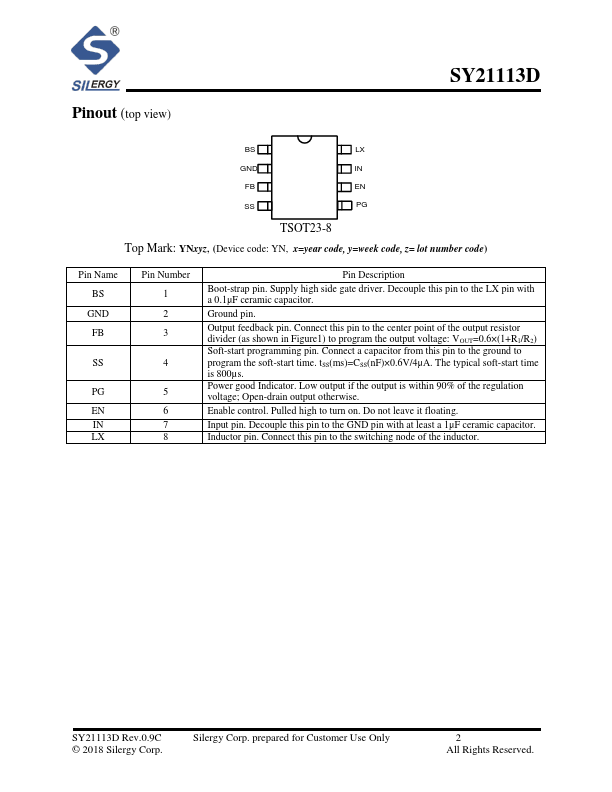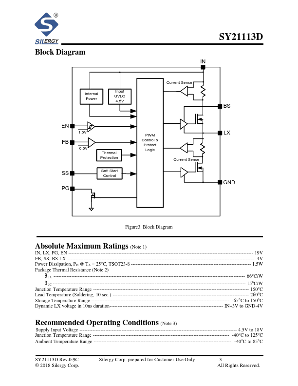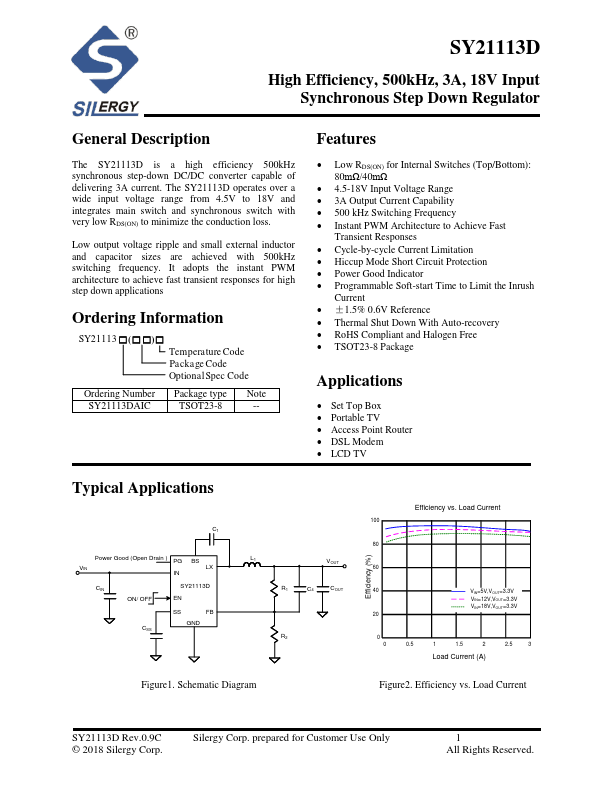 The SY21113D is a high efficiency 500kHz synchronous step-down DC/DC converter capable of delivering 3A current. The SY21113D operates over a wide input voltage range from 4.5V to 18V and integrates main switch and synchronous switch with very low RDS(ON) to minimize the conduction loss.
