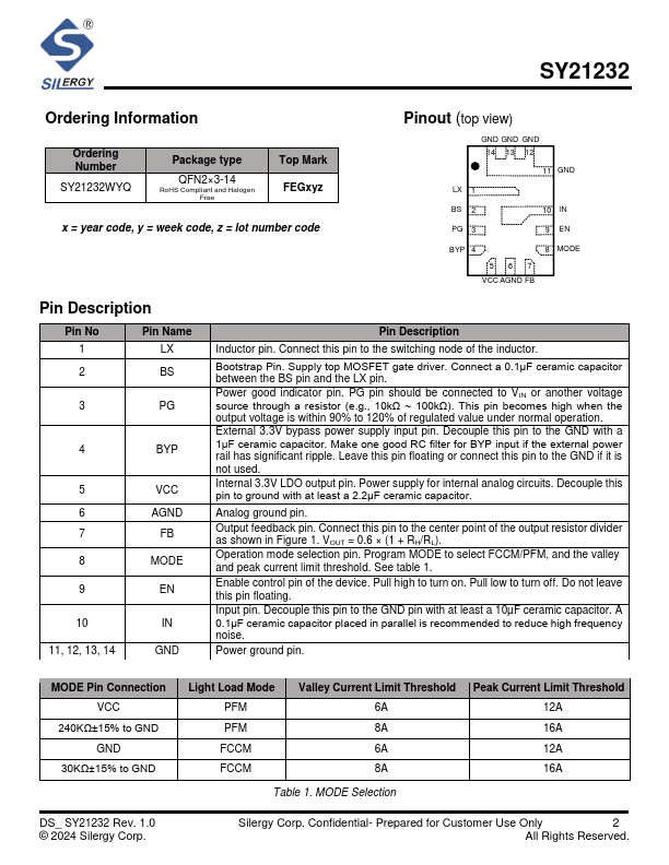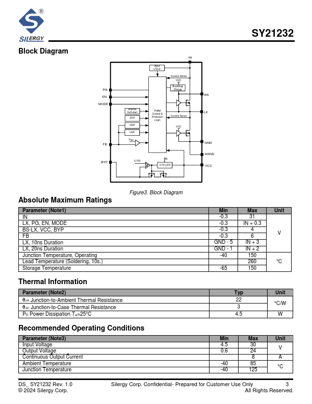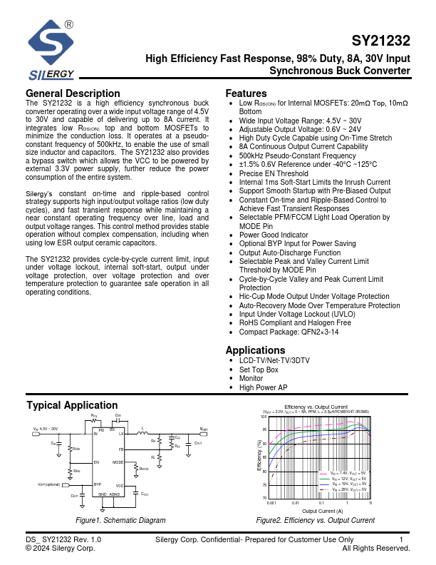 The SY21232 is a high efficiency synchronous buck converter operating over a wide input voltage range of 4.5V to 30V and capable of delivering up to 8A current. It integrates low RDS(ON) top and bottom MOSFETs to minimize the conduction loss. It operates at a pseudoconstant frequency of 500kHz, to enable the use of small size inductor and capacitors. The SY21232 also provides a bypass switch which allows the VCC to be powered by external 3.3V power supply, further reduce the power consumption of the entire system.