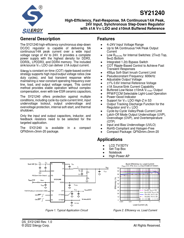 The SY21240 high-efficiency synchronous step-down DC/DC regulator is capable of delivering 9A continuous/14A peak current over a wide input voltage range of 4V to 24V. It provides a plete power supply with the highest density for DDR3, DDR3L, LPDDR3, and DDR4 memory. The included sink/source VTT LDO can deliver ±1A output current.