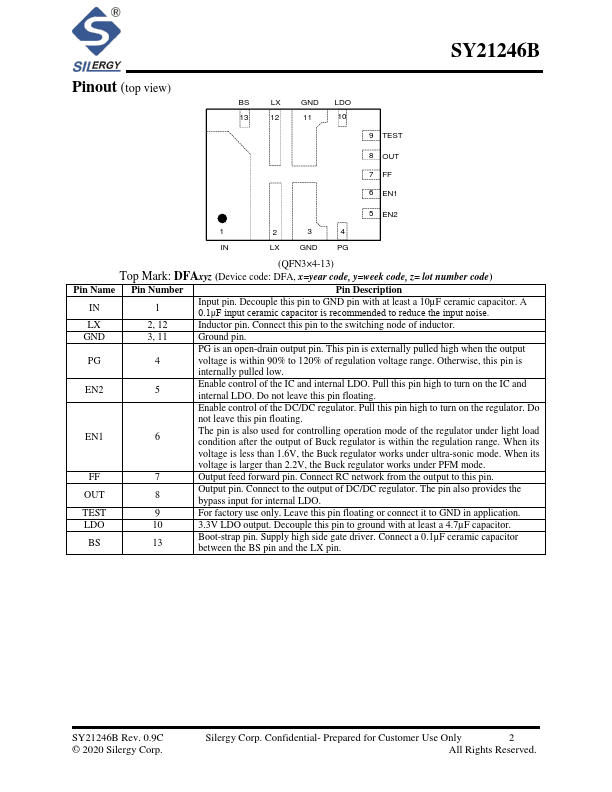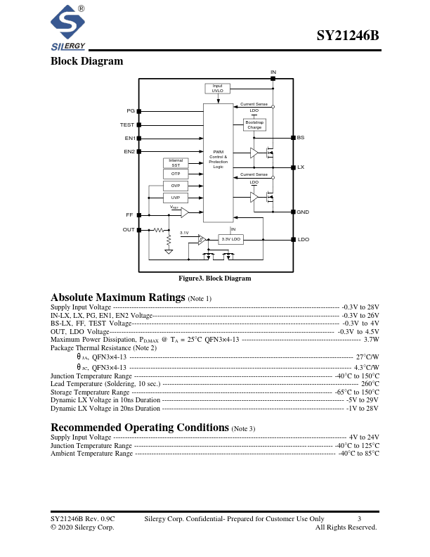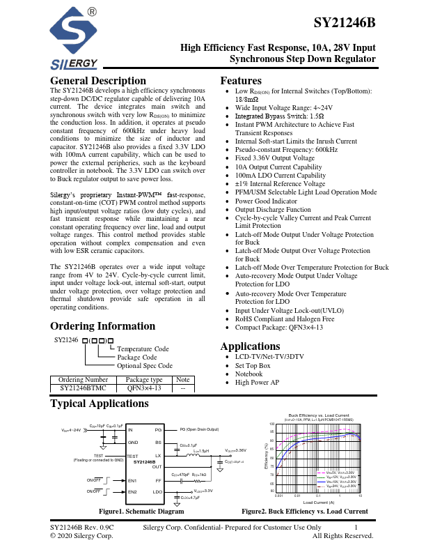 The SY21246B develops a high efficiency synchronous step-down DC/DC regulator capable of delivering 10A current. The device integrates main switch and synchronous switch with very low RDS(ON) to minimize the conduction loss. In addition, it operates at pseudo constant frequency of 600kHz under heavy load conditions to minimize the size of inductor and capacitor. SY21246B also provides a fixed 3.3V LDO with 100mA current capability, which can be used to power the external peripheries, such as the keyboard controller in notebook. The 3.3V LDO can switch over to Buck regulator output...