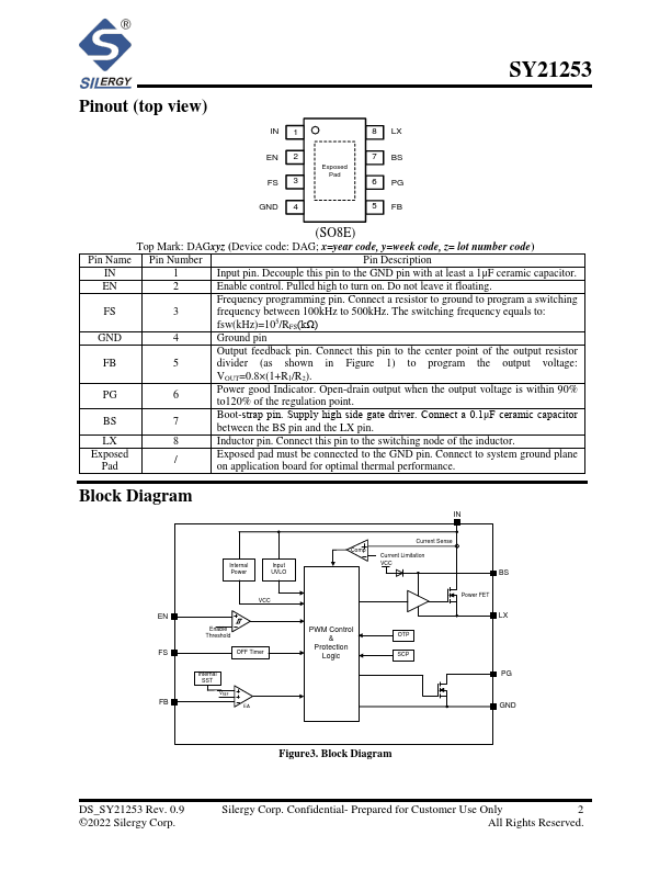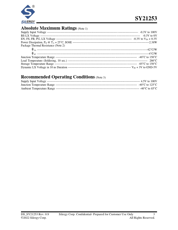 The SY21253 develops a high efficiency, current mode adaptive constant off time controlled, asynchronous step-down DC/DC converter capable of delivering 3A output current. The SY21253 operates over a wide input voltage range from 4.5V to 100V and integrates main switch with very low RDS(ON) to minimize the conduction loss. The switching frequency is adjustable from 100kHz to 500kHz using an external resistor. And the device Features cycle-by-cycle peak current limitation.