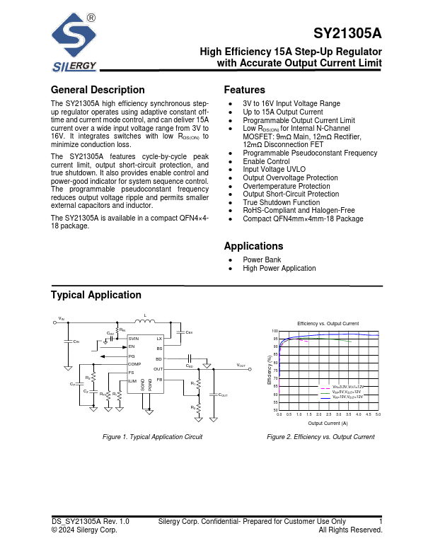 The SY21305A high efficiency synchronous stepup regulator operates using adaptive constant offtime and current mode control, and can deliver 15A current over a wide input voltage range from 3V to 16V. It integrates switches with low RDS(ON) to minimize conduction loss.