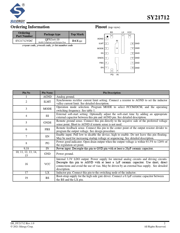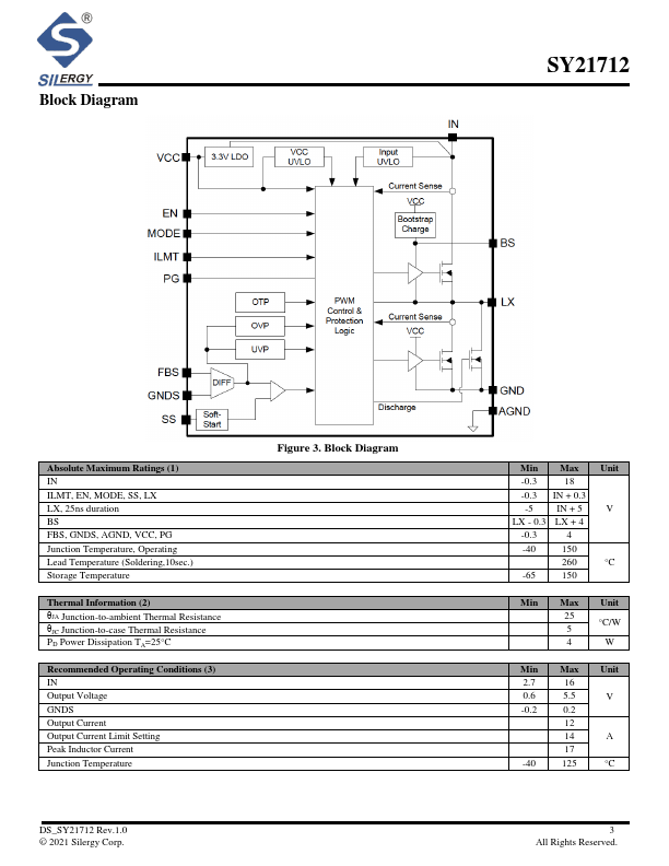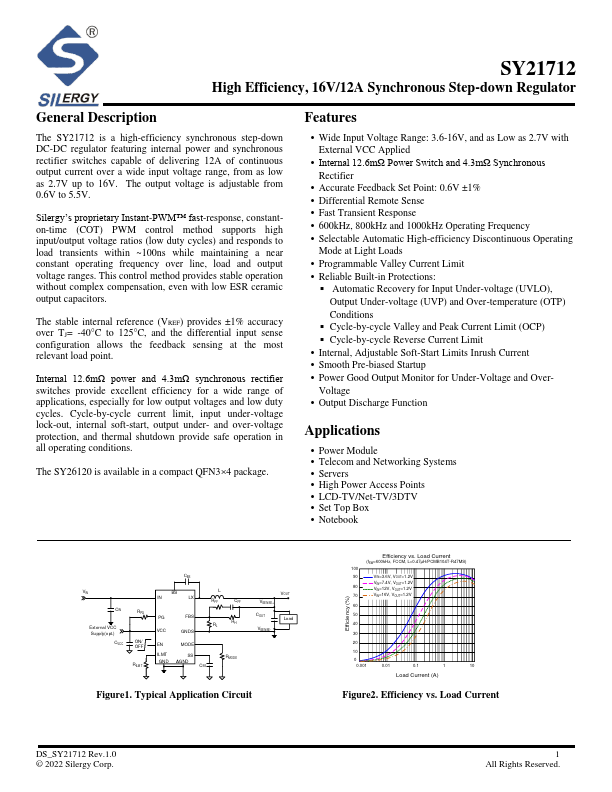 The SY21712 is a high-efficiency synchronous step-down DC-DC regulator featuring internal power and synchronous rectifier switches capable of delivering 12A of continuous output current over a wide input voltage range, from as low as 2.7V up to 16V. The output voltage is adjustable from 0.6V to 5.5V.
