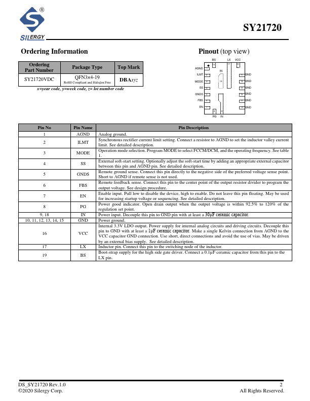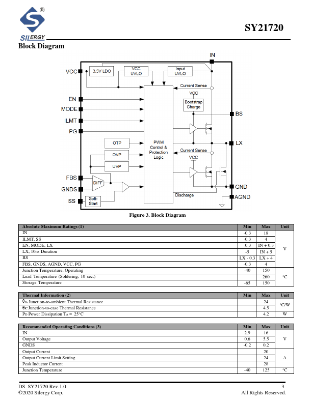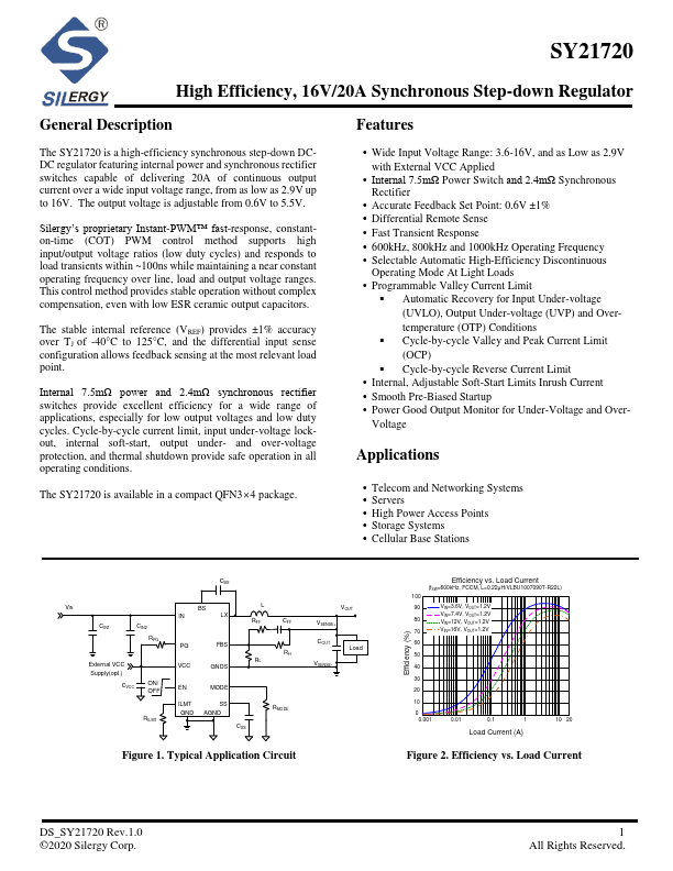 The SY21720 is a high-efficiency synchronous step-down DCDC regulator featuring internal power and synchronous rectifier switches capable of delivering 20A of continuous output current over a wide input voltage range, from as low as 2.9V up to 16V. The output voltage is adjustable from 0.6V to 5.5V.