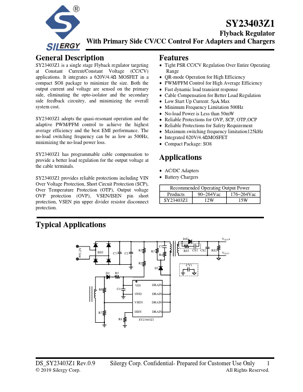 SY23403Z1 is a single stage Flyback regulator targeting at Constant Current/Constant Voltage (CC/CV) applications. It integrates a 620V/4.4Ω MOSFET in a compact SO8 package to minimize the size.