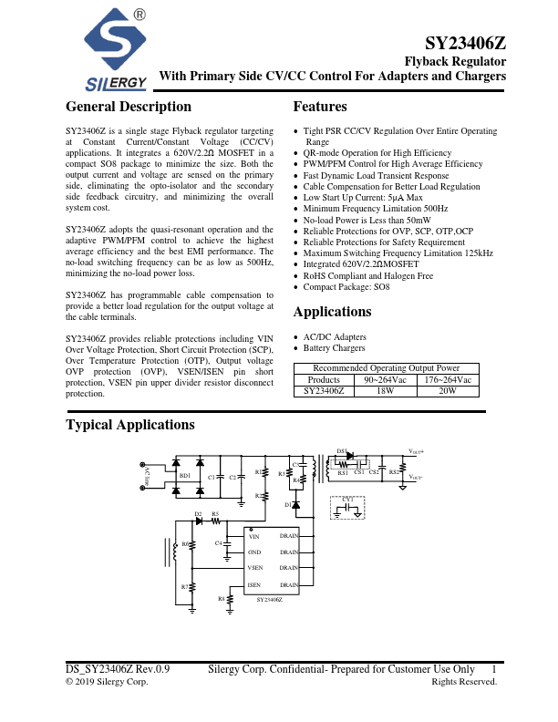 SY23406Z is a single stage Flyback regulator targeting at Constant Current/Constant Voltage (CC/CV) applications. It integrates a 620V/2.2Ω MOSFET in a compact SO8 package to minimize the size.