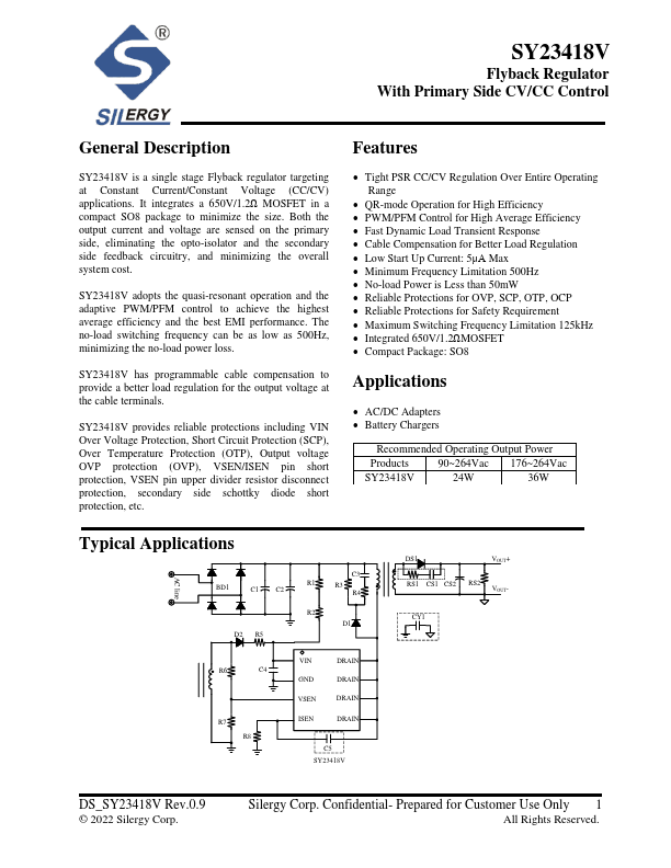 SY23418V is a single stage Flyback regulator targeting at Constant Current/Constant Voltage (CC/CV) applications. It integrates a 650V/1.2Ω MOSFET in a compact SO8 package to minimize the size.