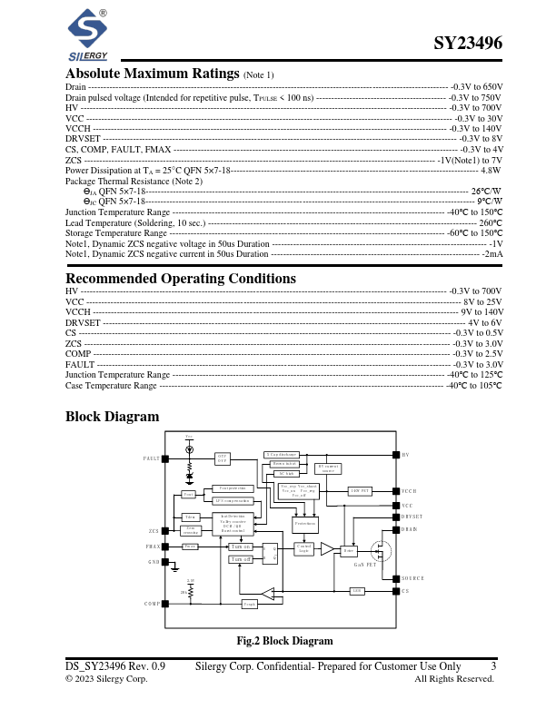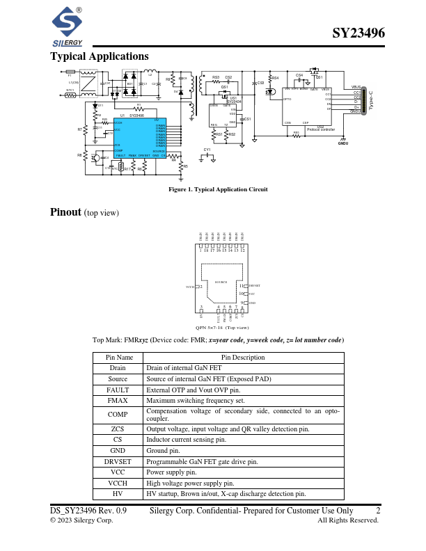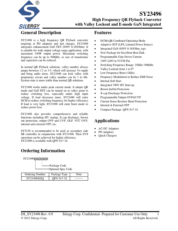 Features SY23496 is a high frequency QR Flyback converter targeting at PD adaptors and fast charges. SY23496 integrates enhancement GaN FET (650V 0.165Ohm). It is suitable for wide output voltage range application, with maximum 140W output power.