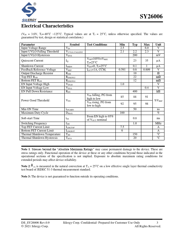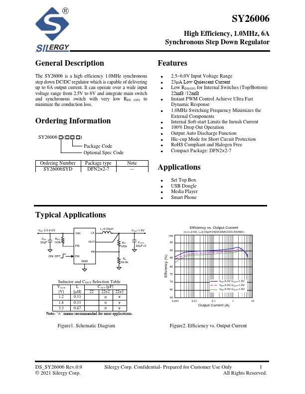The SY26006 is a high efficiency 1.0MHz synchronous step down DC/DC regulator which is capable of delivering up to 6A output current. It can operate over a wide input voltage range from 2.5V to 6V and integrate main switch and synchronous switch with very low RDS (ON) to minimize the conduction loss.