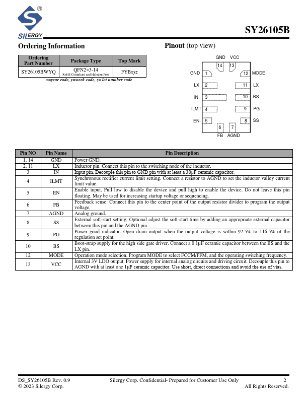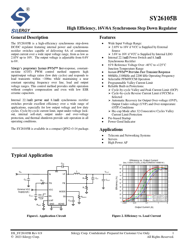 The SY26105B is a high-efficiency synchronous step-down DC/DC regulator featuring internal power and synchronous rectifier switches capable of delivering 6A of continuous output current over a wide input voltage range, from as low as 2.85V up to 16V. The output voltage is adjustable from 0.6V to 6V. Silergy’s proprietary Instant-PWM™ fast-response, constanton-time (COT) PWM control method supports high input/output...