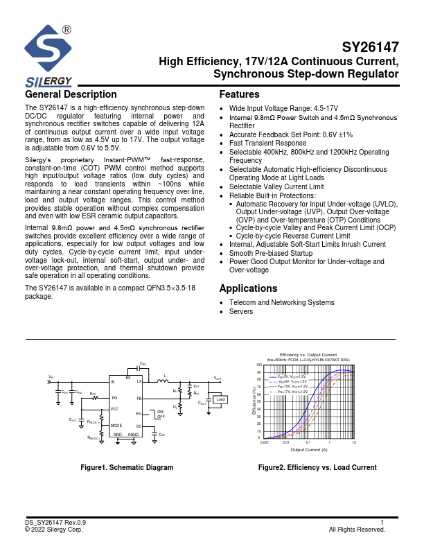 The SY26147 is a high-efficiency synchronous step-down DC/DC regulator featuring internal power and synchronous rectifier switches capable of delivering 12A of continuous output current over a wide input voltage range, from as low as 4.5V up to 17V. The output voltage is adjustable from 0.6V to 5.5V. Silergy’s proprietary Instant-PWM™ fast-response, constant-on-time (COT) PWM control method supports high...