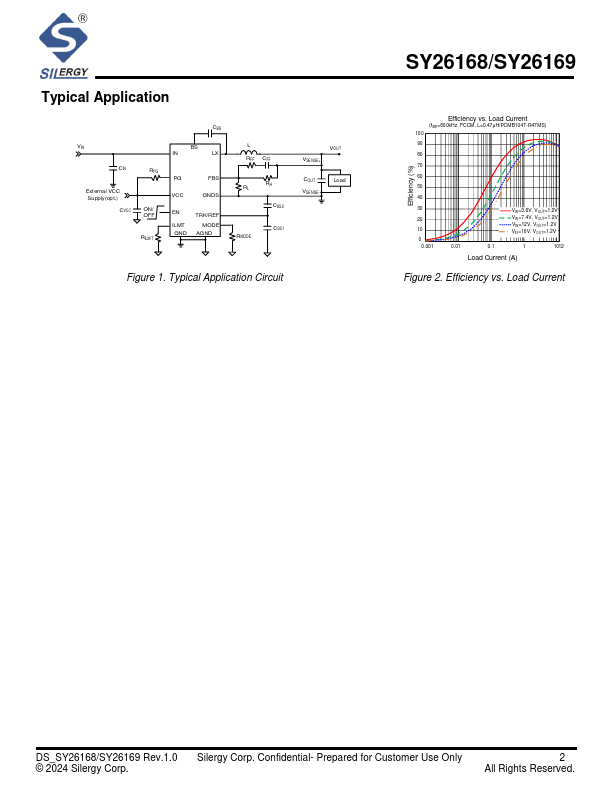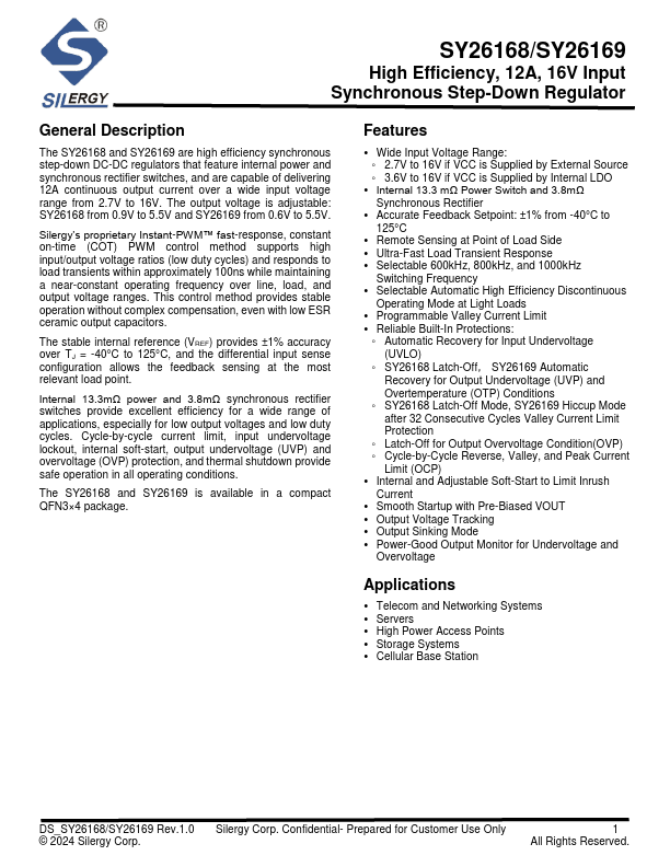 The SY26168 and SY26169 are high efficiency synchronous step-down DC-DC regulators that feature internal power and synchronous rectifier switches, and are capable of delivering 12A continuous output current over a wide input voltage range from 2.7V to 16V. The output voltage is adjustable: SY26168 from 0.9V to 5.5V and SY26169 from 0.6V to 5.5V.