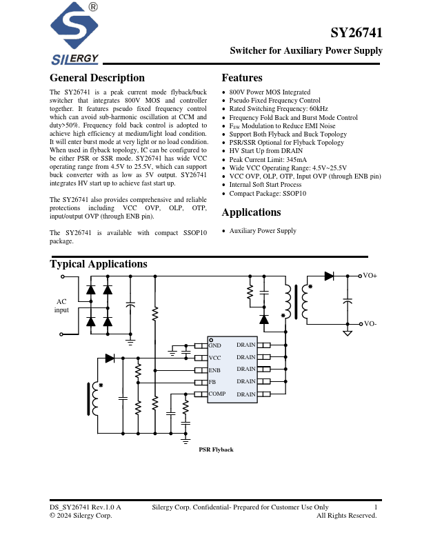 The SY26741 is a peak current mode flyback/buck switcher that integrates 800V MOS and controller together. It features pseudo fixed frequency control which can avoid sub-harmonic oscillation at CCM and duty>50%.