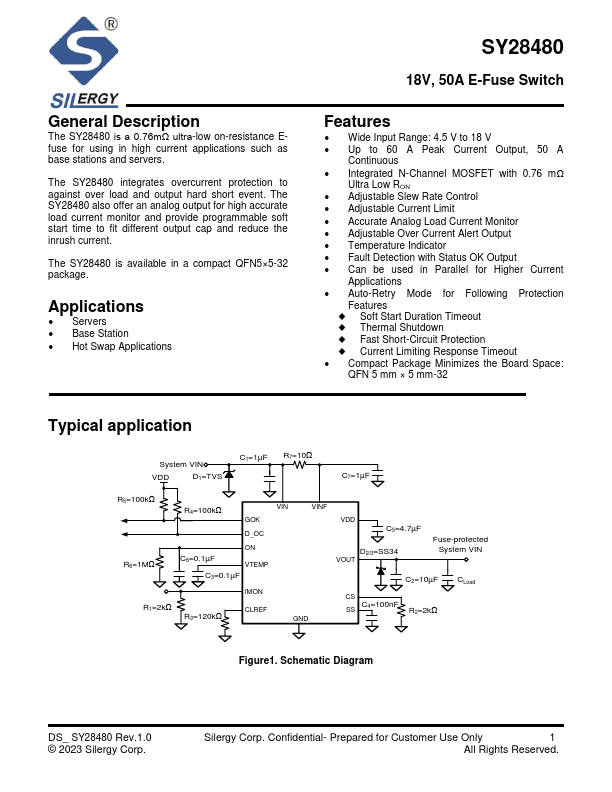The SY28480 is a 0.76mΩ ultra-low on-resistance Efuse for using in high current applications such as base stations and servers.