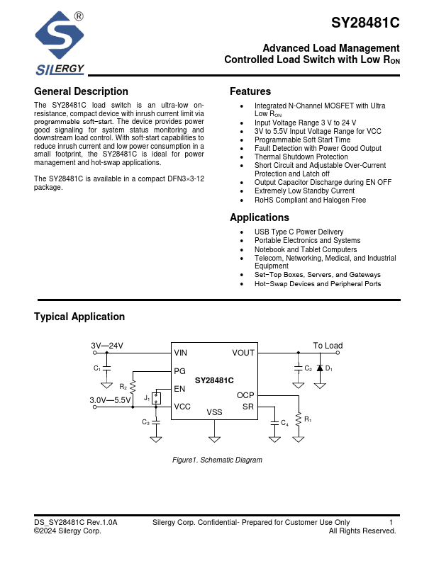 The SY28481C load switch is an ultra-low onresistance, pact device with inrush current limit via programmable soft−start.