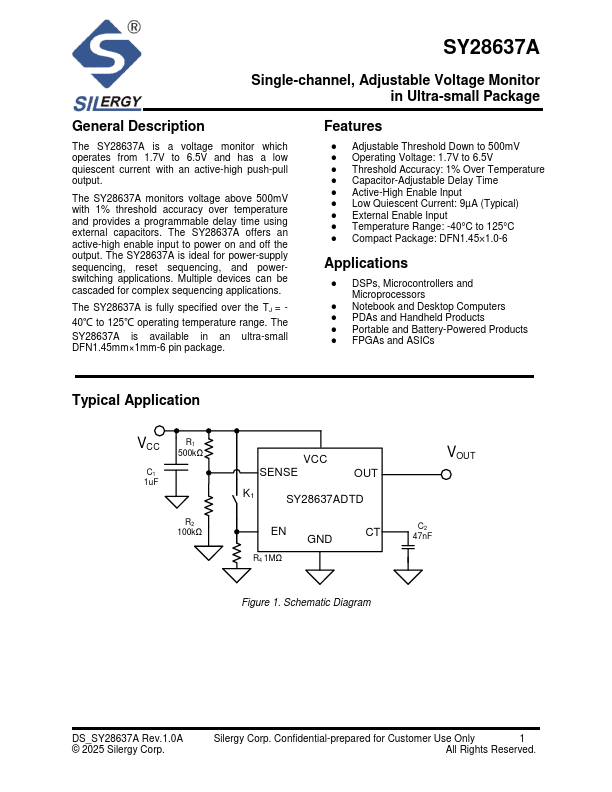 The SY28637A is a voltage monitor which operates from 1.7V to 6.5V and has a low quiescent current with an active-high push-pull output. The SY28637A monitors voltage above 500mV with 1% threshold accuracy over temperature and provides a programmable delay time using external capacitors.