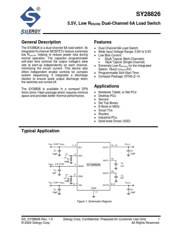 The SY28826 is a dual-channel 6A load switch. Its integrated N-channel MOSFETs feature extremely low RDS(ON), helping to reduce power loss during normal operation.