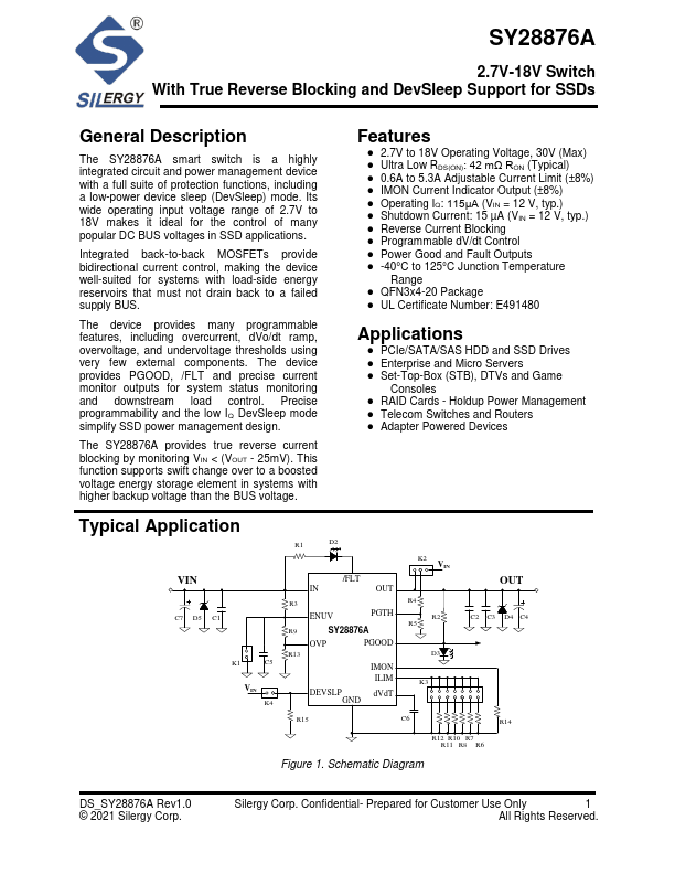 The SY28876A smart switch is a highly integrated circuit and power management device with a full suite of protection functions, including a low-power device sleep (DevSleep) mode.