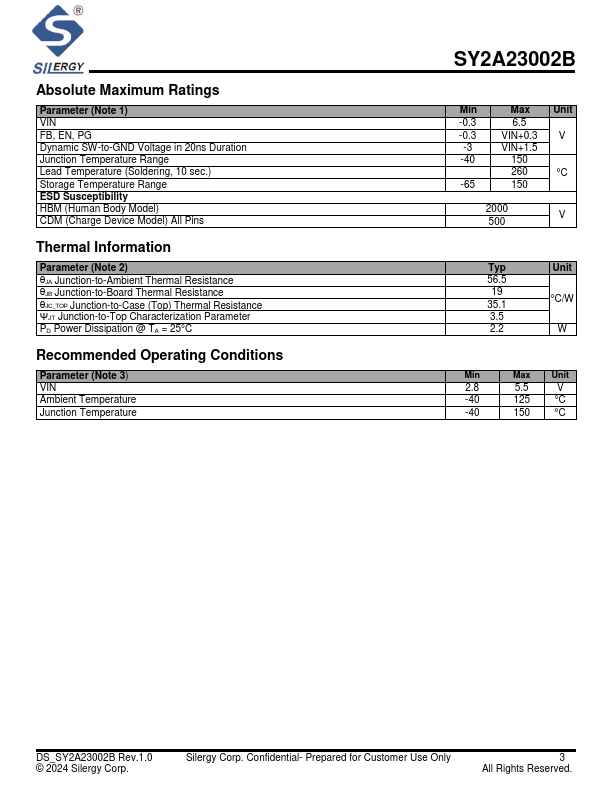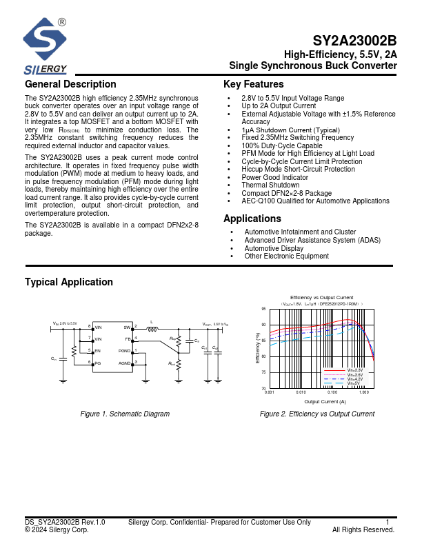 The SY2A23002B high efficiency 2.35MHz synchronous buck converter operates over an input voltage range of 2.8V to 5.5V and can deliver an output current up to 2A. It integrates a top MOSFET and a bottom MOSFET with very low RDS(ON) to minimize conduction loss. The 2.35MHz constant switching frequency reduces the required external inductor and capacitor values.