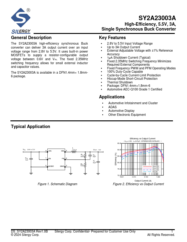 The SY2A23003A high-efficiency synchronous Buck converter can deliver 3A output current over an input voltage range from 2.8V to 5.5V. It uses built-in power MOSFETs to supply a resistor-configurable output voltage between 0.6V and VIN. The fixed 2.35MHz switching frequency allows for small external inductor and capacitor values. The SY2A23003A is available in a DFN1.4mm× 1.8mm6 package.