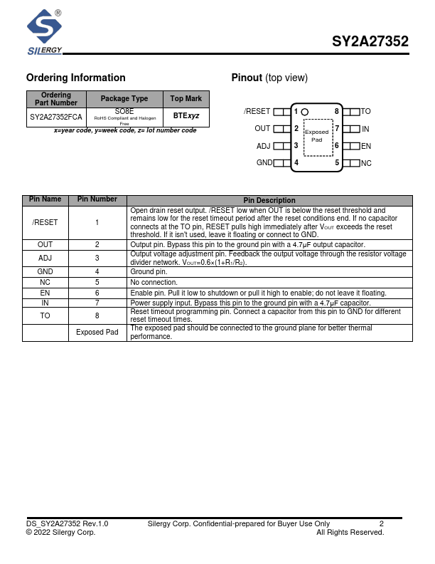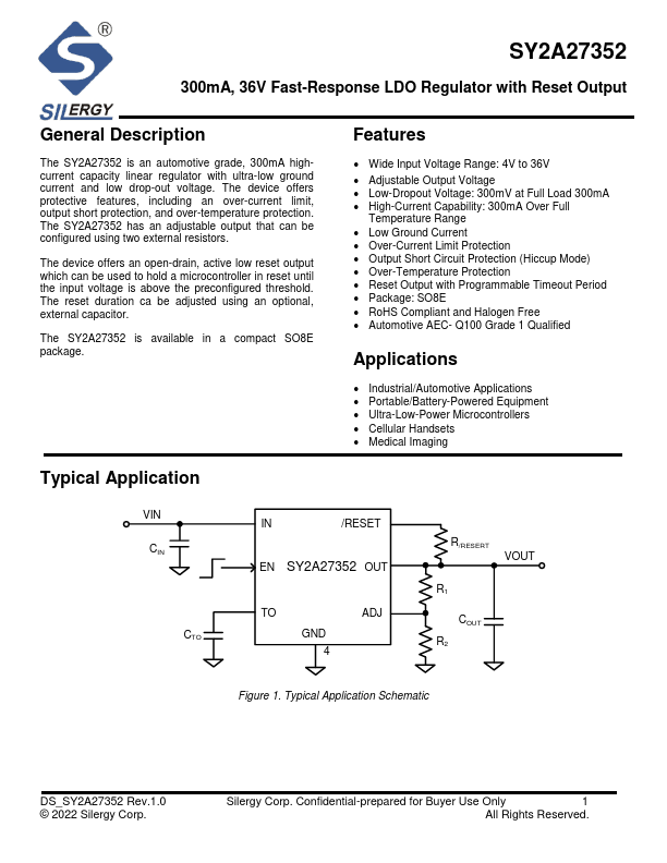 The SY2A27352 is an automotive grade, 300mA highcurrent capacity linear regulator with ultra-low ground current and low drop-out voltage. The device offers protective.