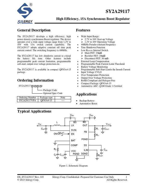 The SY2A29117 develops a high efficiency, high power density synchronous Boost regulator. The device operates over a wide input voltage range from 1.2V to 16V with 15A switch current capability. The SY2A29117 adopts adaptive constant off time peak current control. The switching frequency is 400k Hz.