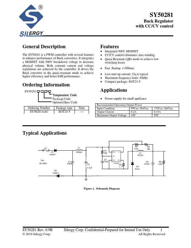The SY50281 is a PWM controller with several Features to enhance performance of Buck converters. It integrates a MOSFET with 500V breakdown voltage to decrease physical volume. Both constant current and voltage regulations are achieved by the controller. It drives the Buck converter in the quasi-resonant mode to achieve higher efficiency and better EMI performance.
